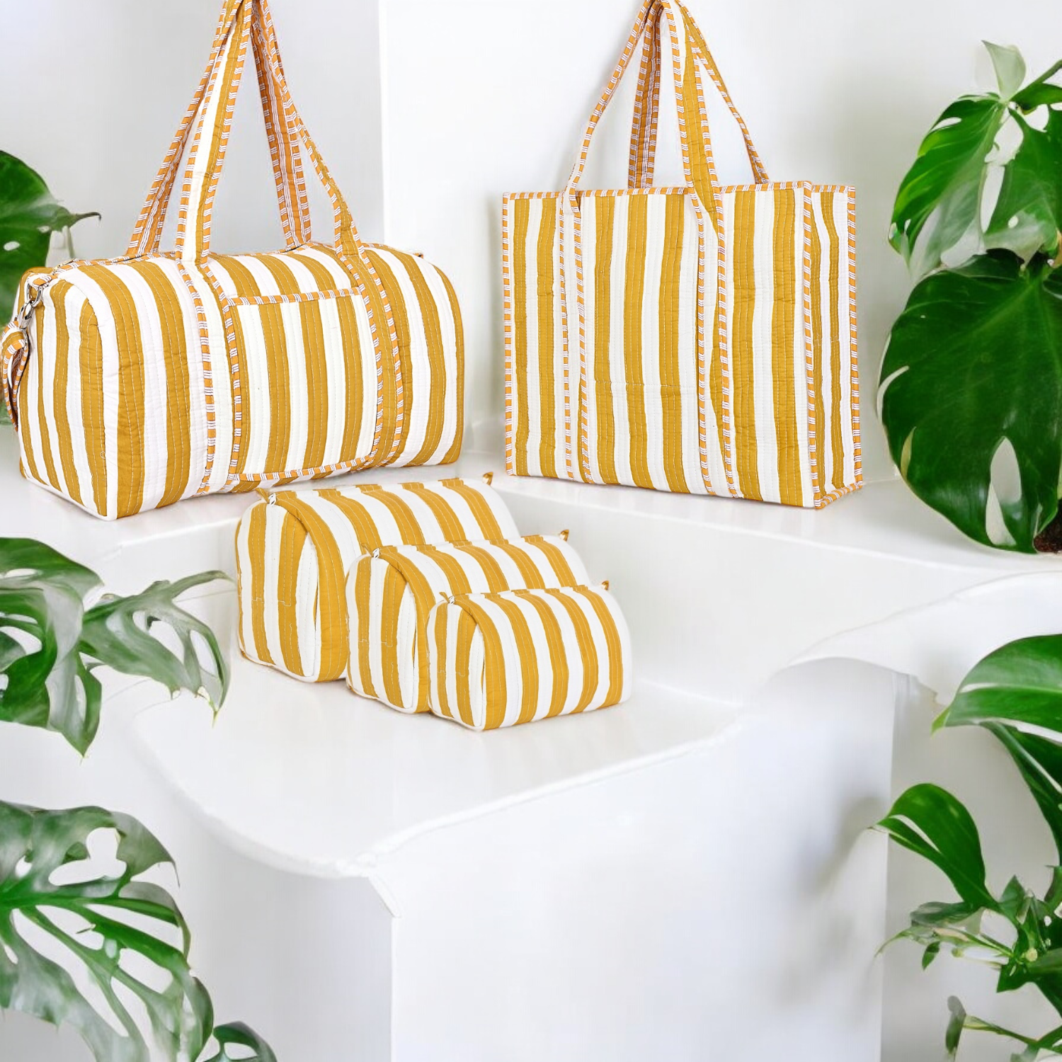 Every Gold Stripe Travel Set is handmade from soft, durable quilted cotton by skilled artisans in India. This bag doesn’t just look good—itdoesgood too: 10% of every purchase goes back to grassroots initiatives supporting local communities. Ethically crafted, beautifully bold, and built to make an impact—because style means more when it gives back.